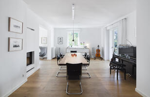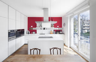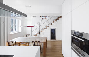 In einem Mehrfamilienhaus aus den 1930er Jahren wurden die Wohneinheiten des ersten und zweiten Geschosses zu einer 250 qm großen Maisonette-Wohnung umgebaut, verbunden durch eine innen liegende Treppe. Im ersten Geschoss, das dem Wohnen, Kochen und Essen dient, ist die Küche der zentrale Raum. Hier befindet sich die einläufige Treppe, welche die Wohnebene mit dem darüber liegenden Schlafgeschoss, bestehend aus fünf Zimmern, verbindet. Mit dem Wohngeschoss entstand auch eine neue Terrasse, angelegt auf dem darunterliegenden Anbau des Hauses. Durch die großflächige Terrasse wurden die vorhandenen zwei Balkone aus dem Bestand nicht mehr erforderlich. Sie wurden geschlossen, verglast und in die Wohnfläche integriert.